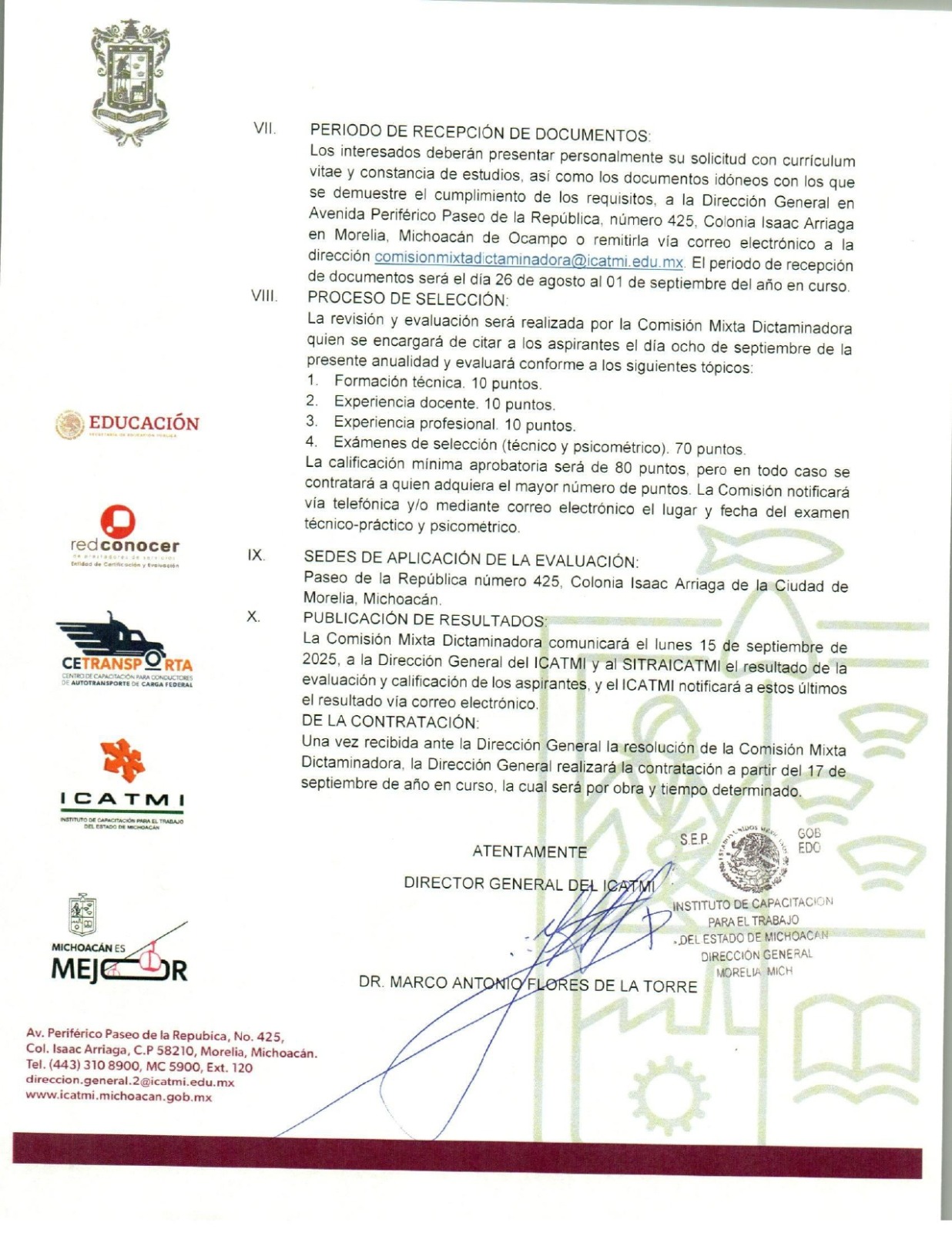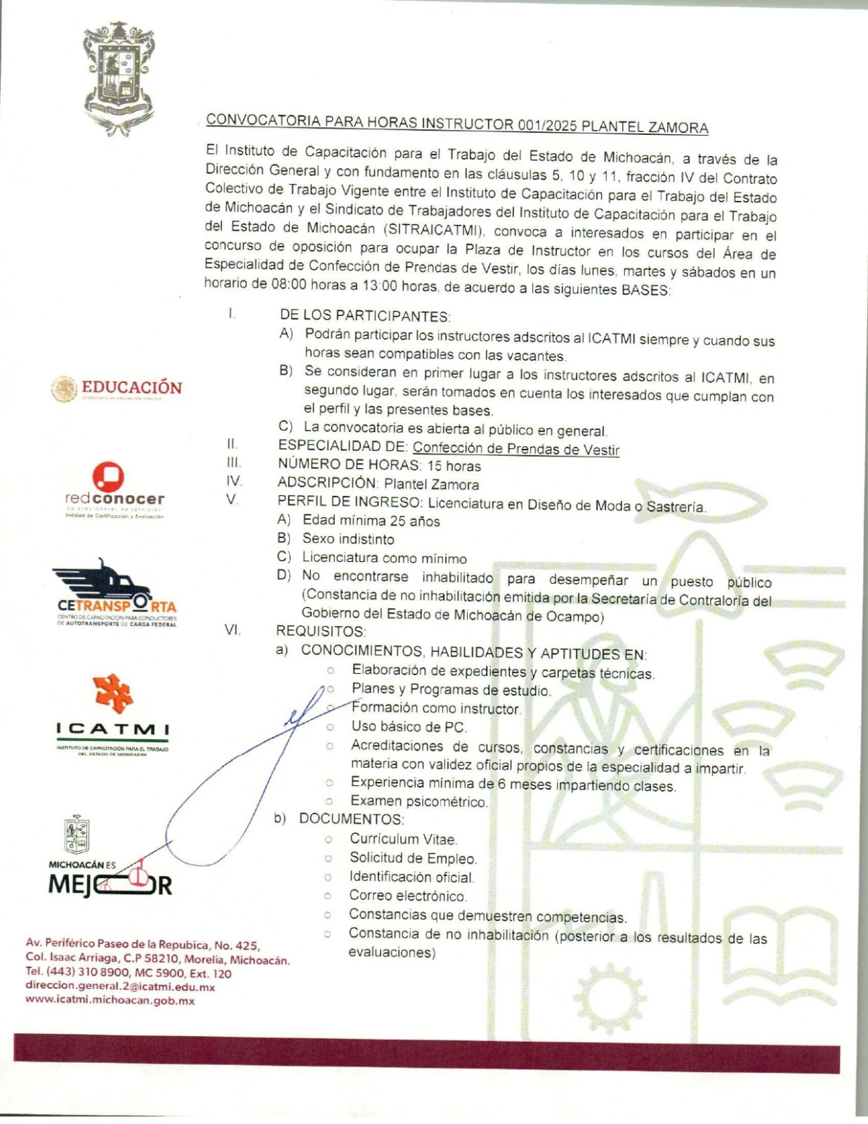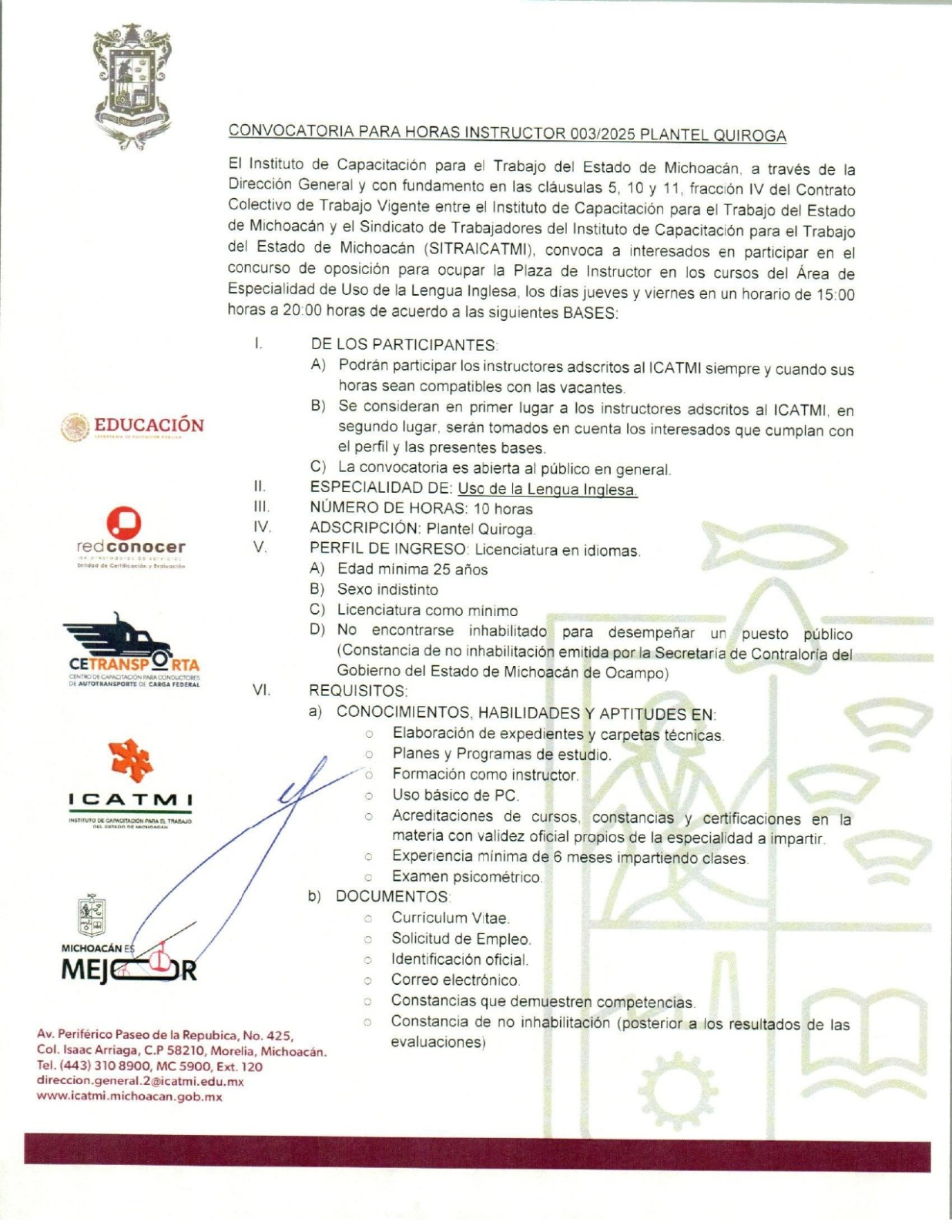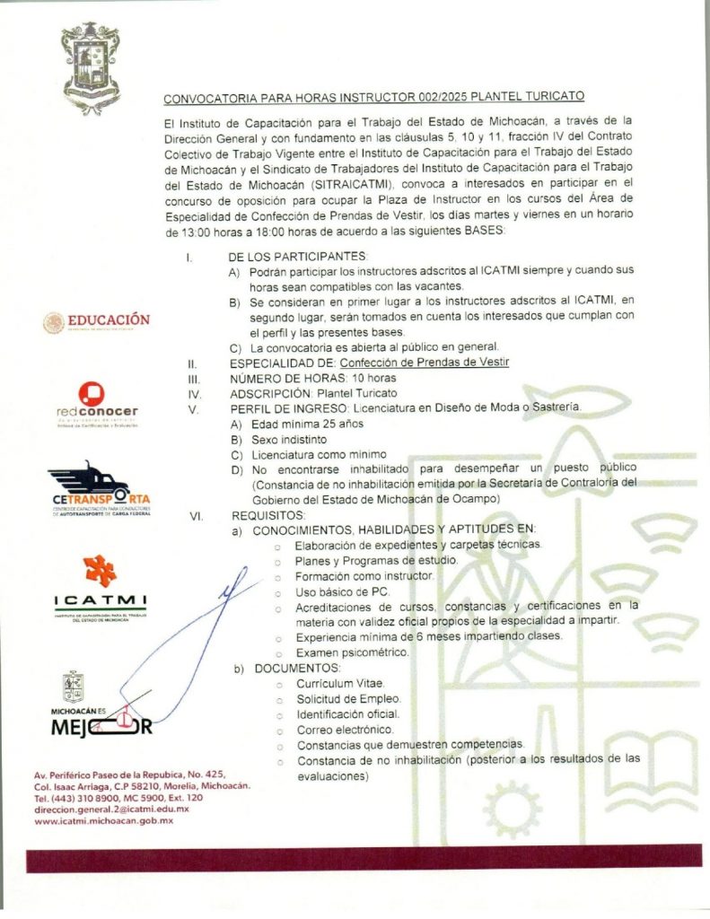 El Instituto de Capacitación para el Trabajo del Estado de Michoacán (ICATMI), invita a las y los instructores a participar en la Convocatoria de Asignación de Horas en los planteles de Turicato, Zamora y Quiroga.