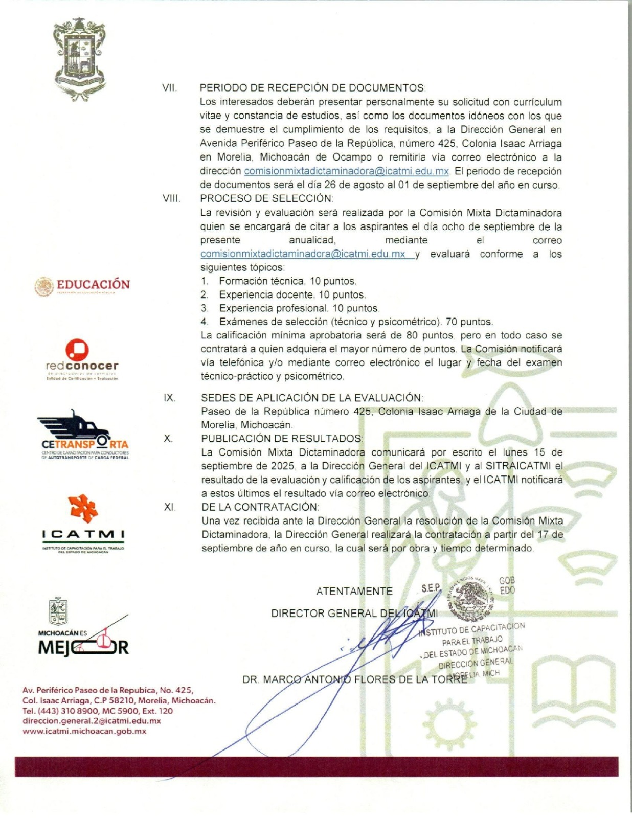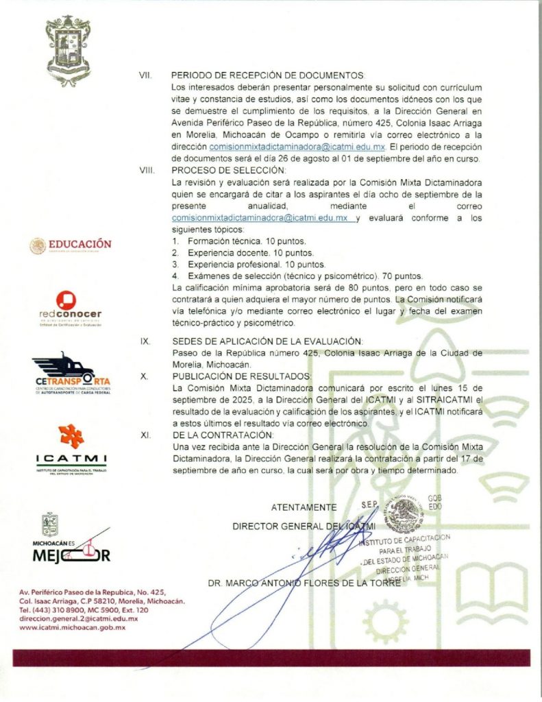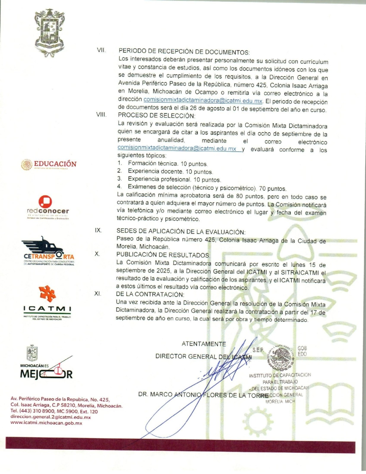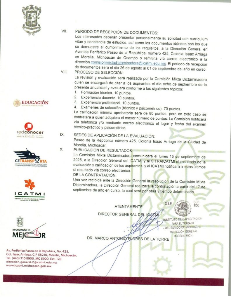 El Instituto de Capacitación para el Trabajo del Estado de Michoacán (ICATMI), invita a las y los instructores a participar en la Convocatoria de Asignación de Horas en los planteles de Turicato, Zamora y Quiroga.